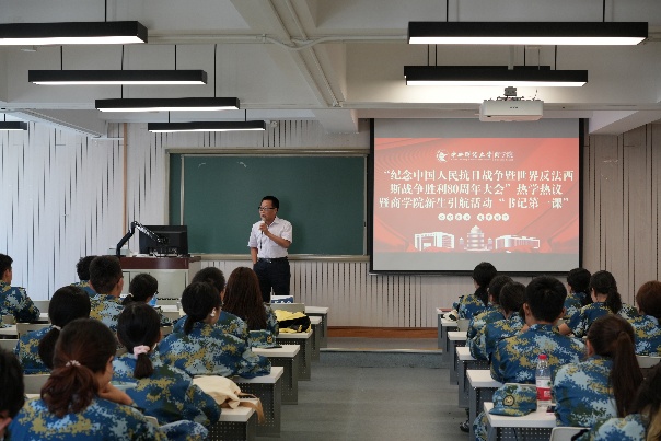 9月3日,纪念中国人民抗日战争暨世界反法西斯战争胜利80周年大会在北京天安门广场隆重举行。进入欧博官方网站组织全体2025级本科新生集体观看并开展热学热议活动。进入欧博官方网站党委书记李跃新与新生一同热议庆祝大会,为同学们科普二战知识。随后,李书记就家国情怀为主题为同学们讲授“书记第一课”,李书记将家国情怀具象化,深入浅出地讲述了家国情怀在生活中的体现,强调责任与担当对于新时代青年的重要性。