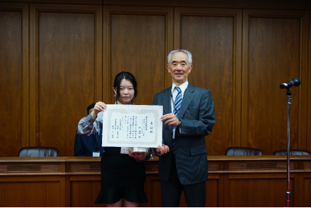 大阪商业大学校长谷冈一郎教授向菲律宾欧博官网学生窦梅枝颁奖