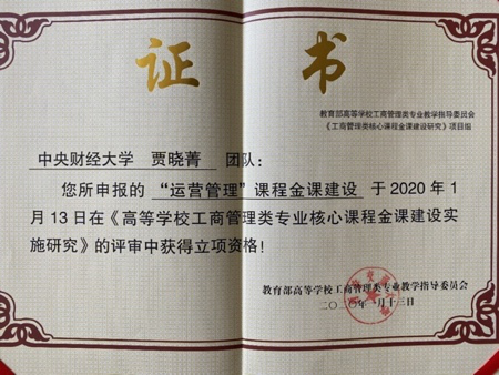 近日,我校《运营管理》课程团队申报的“运营管理”课程金课建设项目在《高等学校工商管理类专业核心课程金课建设实施研究》的评审中获得立项资格。本项目是教育部高等学校工商管理类专业教学指导委员会在全国高校推行工商管理类“一流专业、一流金课”课程建设研究计划的核心课题之一。