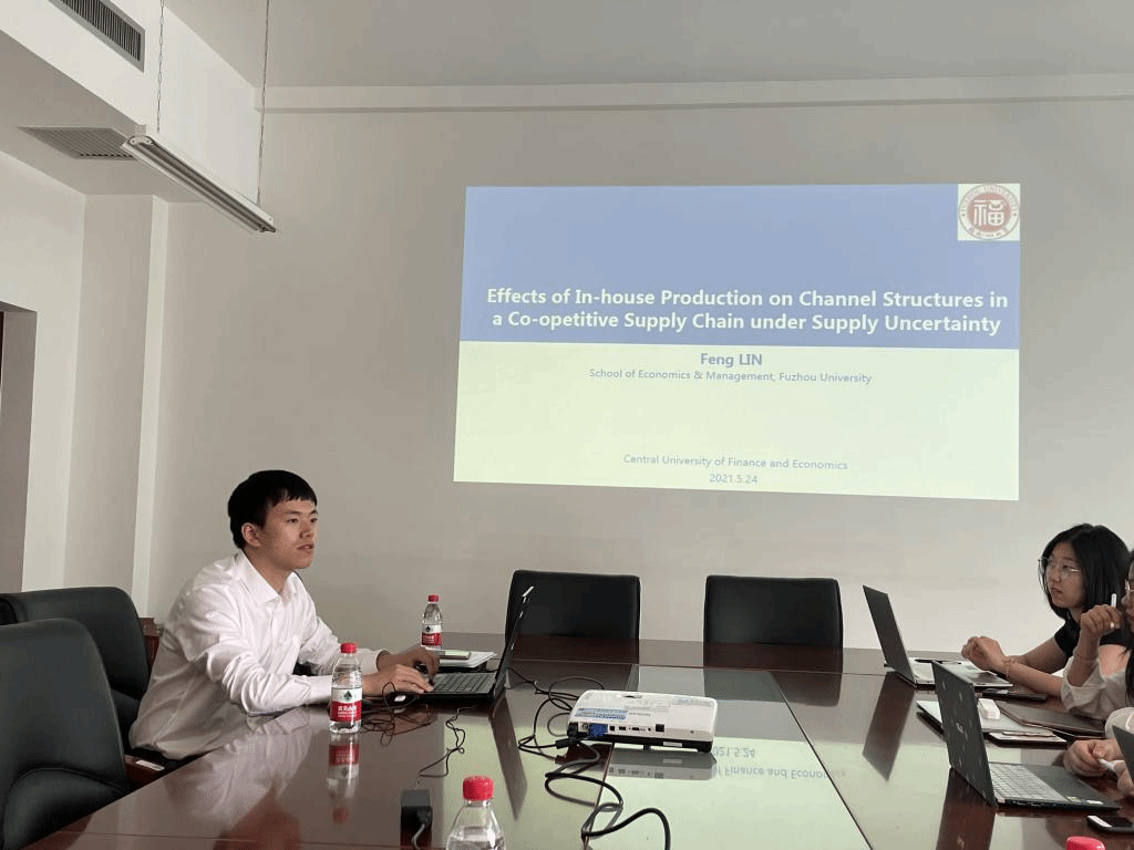 供应链与运营管理系卢继周老师主持并介绍了林峰老师的履历。林峰老师是西安交通大学博士和香港城市大学博士(联合培养),目前是福州大学经济及管理学院讲师,硕士生导师,入选福州大学“旗山学者”(海外项目)奖励支持计划。主要从事供应链金融下运作管理、跨境供应链下竞合决策等领域研究。已在Omega,OR Society,CIE,EJOR、运筹与管理等国内外知名期刊发表论文15篇。