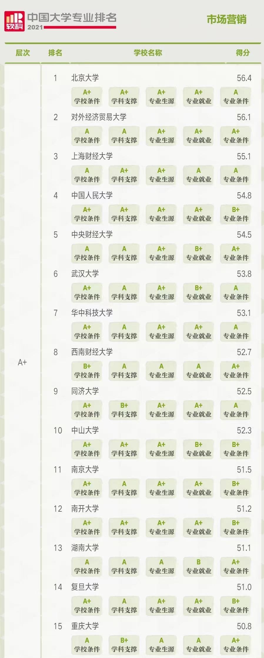 2021年6月22日,高等教育评价专业机构软科正式发布2021“软科中国大学专业排名”。排名包括509个本科专业,每个专业榜单发布的是所有开设该专业的高校中排名位列前50%的高校,共有925所高校的28550个专业上榜。